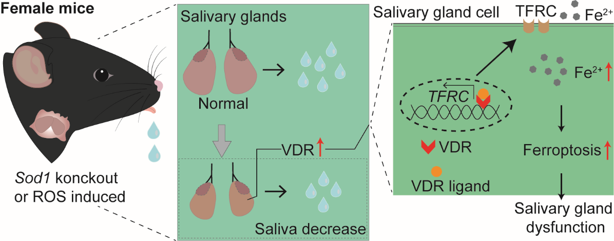人体有三对大唾液腺和很多对小唾液腺,其主要功能是分泌唾液,用于维护口腔的完整性和功能、保护牙齿和口咽粘膜、协助言语、促进咀嚼和吞咽食物、帮助消化和维持口腔微生物组的稳态。氧化应激是减少唾液流动和损害唾液腺组织的关键因素,女性比男性更容易出现唾液分泌不足,其潜在机制尚不清楚。维生素D受体(VDR)在调控细胞稳态中具有重要作用,但其在唾液腺功能障碍中的角色尚未阐明。