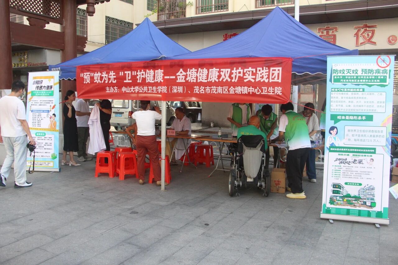 9月5日上午,团队联合茂名市茂南区金塘镇中心卫生院开展“‘预’蚊为先,‘卫’护健康”宣传及义诊活动。医护人员为居民免费检查血压、血糖并提供专业建议,学生团队则结合专业知识为居民提供健康指导。