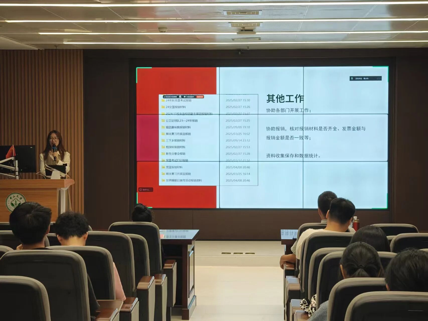 紧接着,院团委副书记刘雁对团委年度工作进行汇报,报告陈述了团委在思想引领、校园活动、服务同学、自身建设等方面的工作突出与成效,并对未来团学工作进行展望。