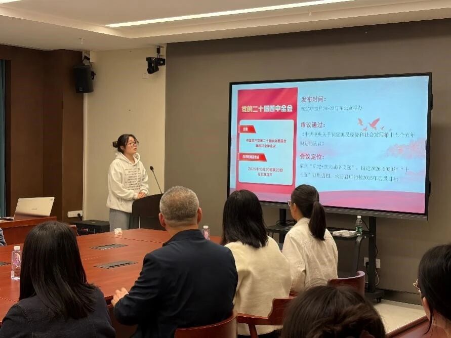 接着,研究生第二党支部林晓语、陈雅祯围绕党的二十届四中全会精神,结合科技自立自强的时代命题,分享学习心得。她们从“坚持和完善中国特色社会主义制度、推进国家治理体系和治理能力现代化”出发,聚焦科技创新核心地位,联系自身科研和学习体会,阐述了新时代青年党员应强化创新意识、树立科技自信,做科技自立自强的践行者和推动者,将个人学术追求融入服务国家战略和粤港澳大湾区建设的发展大局。