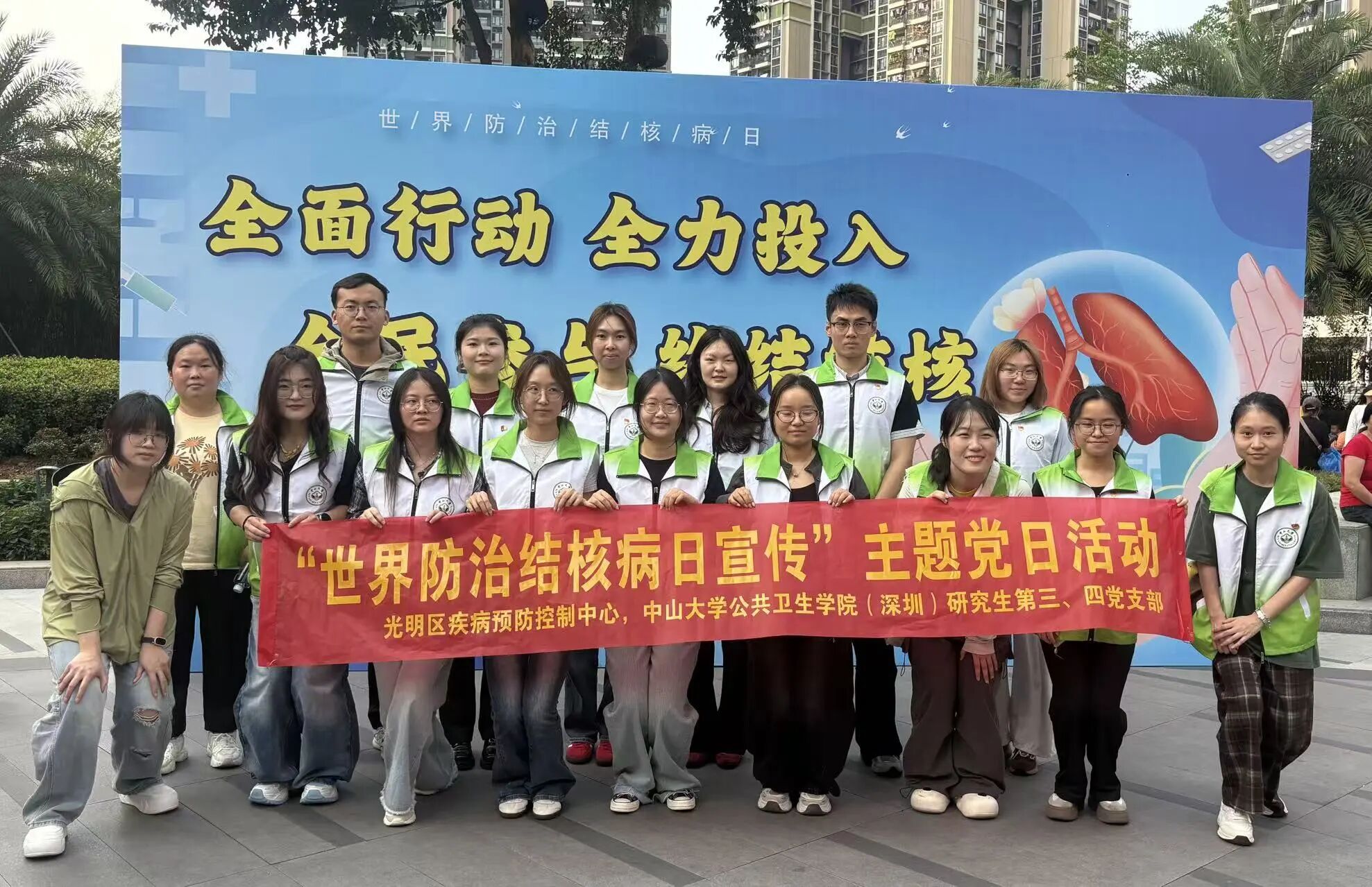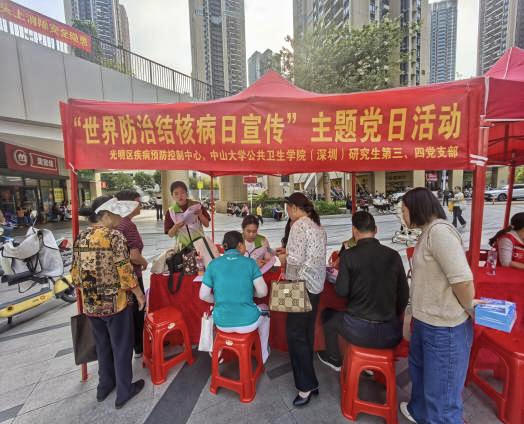 每年的3月24日是“世界防治结核病日”,我国2026年“世界防治结核病日”的宣传主题是“全民行动 全力投入 全民参与 终结结核”。2026年3月24日下午,太阳网集团tcy8722(深圳)研三、研四党支部联合光明区疾病预防控制中心在甲子塘社区英荟城广场共同举办世界防治结核病日主题宣传活动。活动紧扣“全面行动 全力投入 全民参与 终结结核”的主题,旨在提升公众对结核病防治的认知,倡导健康生活方式。